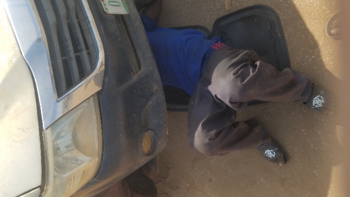 A person lies on their back under the front of a vehicle. They wear a blue shirt, dark pants, and shoes with white designs. A black rectangular object is positioned beneath their torso. The vehicle's front bumper and headlight are visible. The ground appears to be asphalt. The scene suggests the person is performing maintenance or repairs on the vehicle from underneath.