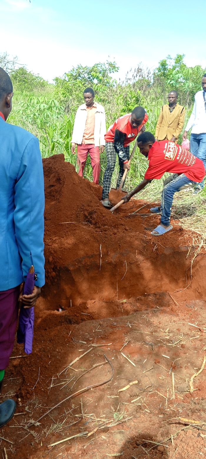 The scene is set outdoors in Namisha, Democratic Republic of the Congo, under a clear blue sky with sparse clouds. Seven adult males are present in an area characterized by disturbed red earth and dense green vegetation. In the foreground, partially visible from the left, a man wears a blue blazer, purple trousers, and holds a folded purple item, possibly an umbrella, in his left hand. In the mid-ground, two men are actively engaged in excavation. One man, wearing a red long-sleeved shirt and black and white checkered pants, uses a shovel to move a mound of red soil. Adjacent to him, a second man, clad in a red short-sleeved shirt, blue jeans, and light blue slides, kneels or squats, utilizing a smaller spade to dig into a visible rectangular excavation cut into the red earth. A substantial pile of excavated red soil is present behind the active diggers. The exposed walls of the excavation reveal layers of dark red soil. In the background, three other men observe the activity. From left to right: one man wears an off-white jacket over an orange shirt and red trousers; another wears a dark golden suit jacket; and a third, partially visible on the far right, wears a white long-sleeved shirt and blue jeans. The ground surface consists of reddish-brown soil scattered with dry plant matter, including twigs and straw-like debris. The background features a dense expanse of tall green grasses and various leafy bushes and trees.
