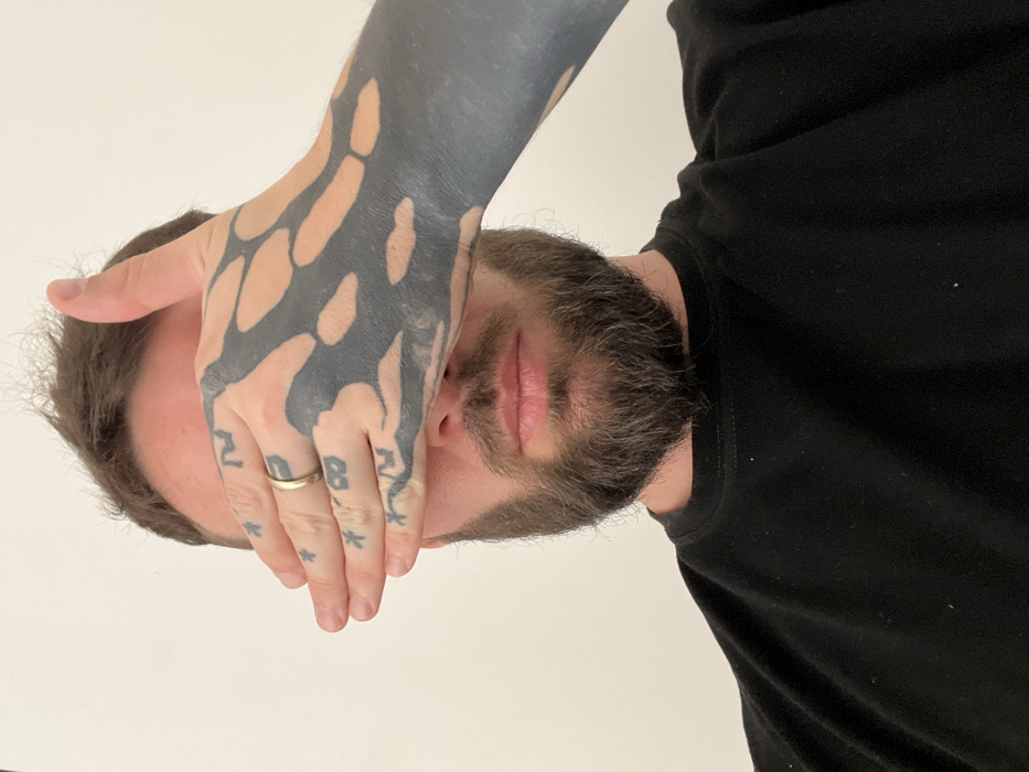 A close-up, chest-up portrait features an adult male with brown hair, a full brown beard, and a mustache. He wears a plain black crew-neck shirt. His right hand is positioned horizontally across his face, covering his eyes and the bridge of his nose. This hand and visible portion of the forearm are extensively tattooed with dark, irregular, organic shapes that leave some skin areas exposed. Several smaller, dark tattoos are present on the knuckles and fingers of the right hand. A simple gold-colored band ring is worn on the ring finger of his right hand. The background is a plain, unfeatured white surface. The scene is located indoors in Cordoba, Argentina.