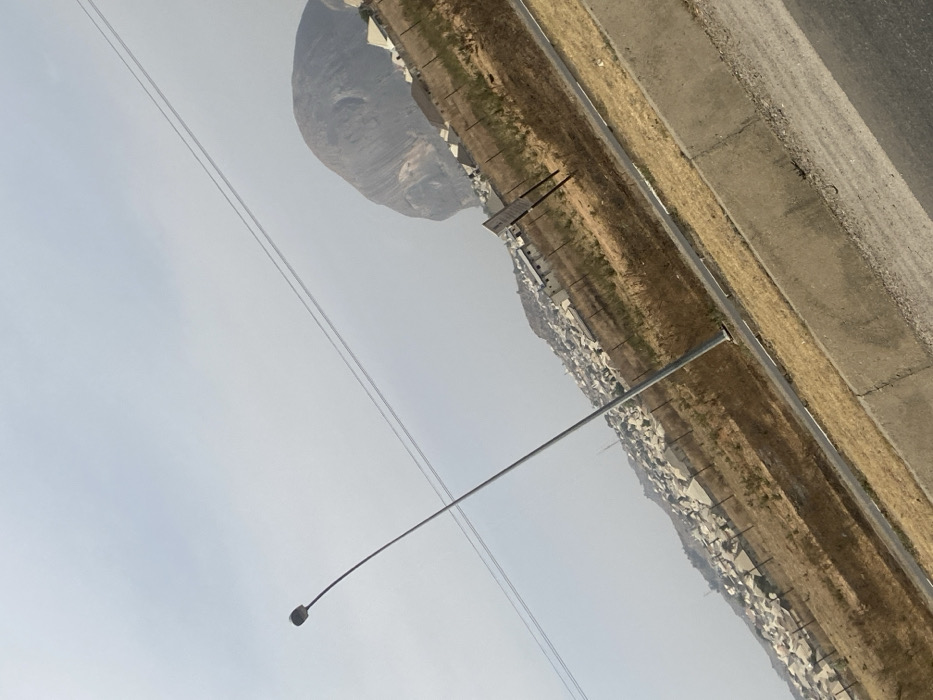 The image depicts an outdoor scene in Sabojibi, Nigeria, under an overcast or hazy sky. The perspective is tilted counter-clockwise. In the foreground, a dark gray paved road is partially visible on the bottom right, bordered by a concrete curb or median. Adjacent to the median is a strip of dry, yellowish-brown grass and dirt. A tall, slender gray street light pole with a single luminaire extends upwards from this strip in the lower-left to the upper-middle. Further back on the right, another dark pole, possibly a signpost, stands in the dry terrain. Two thin, parallel power lines traverse the upper-middle of the frame diagonally from the top-right to the mid-left. In the midground, beyond the dry field, a dense cluster of light-colored buildings with dark roofs is visible, indicating an urban or residential area. These structures appear situated on undulating terrain. A dark fence line runs horizontally, separating the foreground from this populated area. Dominating the upper-right background is a large, smooth-sided gray rock formation or inselberg. No individuals or active interactions are visible within the frame.