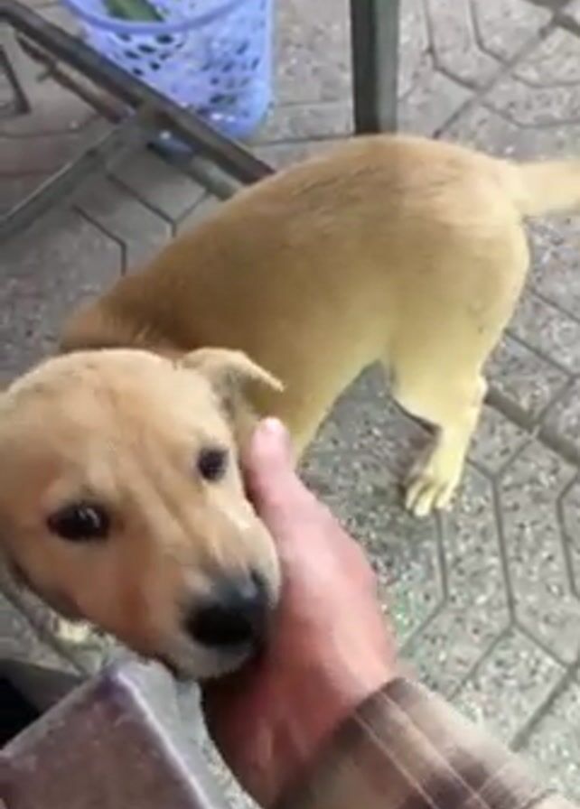 person petting a small, light brown puppy