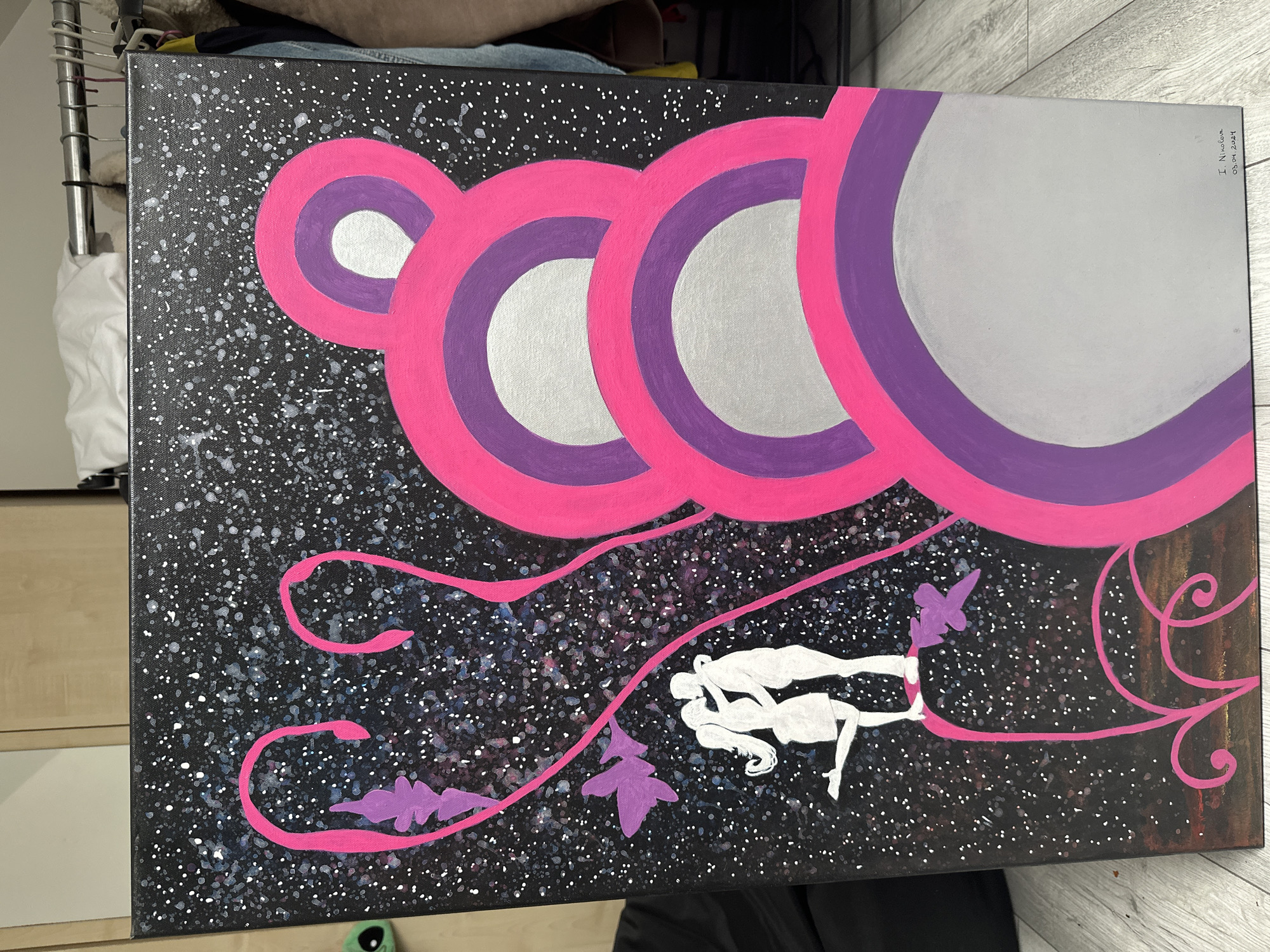 A vertically oriented canvas painting, signed "I. Nikolova" and dated "03.04.2024" in black handwriting in the bottom right corner, is displayed upright on a light wooden laminate floor. The painting features a black background densely speckled with white and iridescent blue-purple dots, simulating a starry sky. On the left side, a white silhouette depicts a couple kissing, with the female figure's left leg lifted. They are positioned atop stylized pink organic forms resembling vines or abstract hearts, which ascend from a reddish-brown base at the bottom left and incorporate purple leaf-like elements. Two distinct pink heart outlines are visible towards the top left. The right side of the canvas is occupied by a column of interlocking concentric semicircles rendered in alternating bands of bright pink, purple, and metallic silver/grey. The painting is situated within an indoor residential environment. Background elements include a light brown wooden cabinet or wardrobe to the left and a metallic clothing rail with various garments, including a white item and darker clothing on hangers, to the right. A small green alien-head plush toy is partially visible on the floor to the far left of the painting. The image contains no discernible visual cues or landmarks to identify a specific location within the city of Reading, United Kingdom.