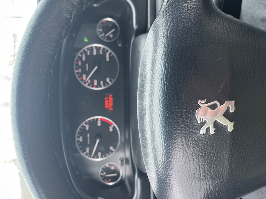 The scene depicts the interior of a vehicle in Карабоўскі сельскі Савет, Belarus, viewed from the driver's perspective. In the foreground, the lower portion of a black, textured leather-wrapped steering wheel is visible, featuring a chrome Peugeot lion emblem centrally positioned on the airbag cover. The upper edge of the steering wheel shows minor wear and visible stitching. Immediately behind the steering wheel, the vehicle's instrument cluster is clearly displayed. On the left, a tachometer indicates approximately 2000 RPM, with a redline starting around 6000 RPM. To the right, a speedometer shows the vehicle's speed at approximately 90 km/h, with a maximum dial reading of 230 km/h. Between these two primary gauges, a digital display in orange numerals shows "509.7" (likely a trip odometer) and "375504" (likely the total odometer). A small gauge to the far left indicates a low fuel level, with its needle positioned near the empty mark and a red warning light illuminated. A corresponding small gauge to the far right indicates a low engine temperature. A green indicator light, consistent with a right turn signal, is illuminated on the upper right side of the speedometer. Through the windshield, visible above the instrument cluster, the blurred background suggests an outdoor, daylight environment with a bright, possibly overcast sky or distant light-colored scenery.