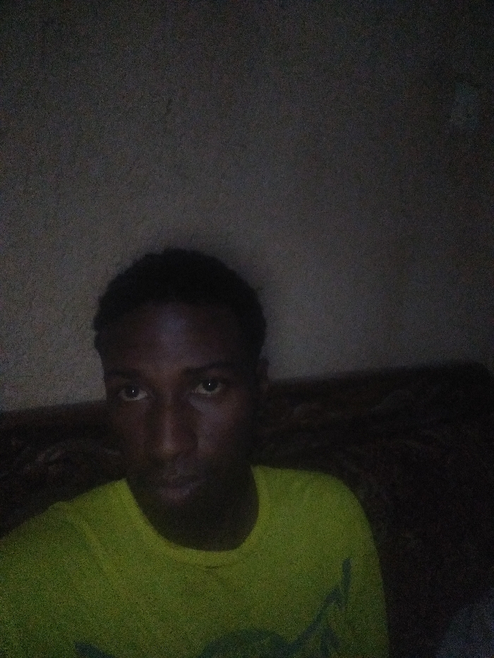 A dimly lit selfie captures a young African American man. His expression is serious and his gaze is direct. He wears a yellow t-shirt with a blurred design. The background features a textured wall above and a dark, patterned couch behind him. The low lighting adds a sense of intimacy to the image, highlighting his features and the simplicity of the surroundings.