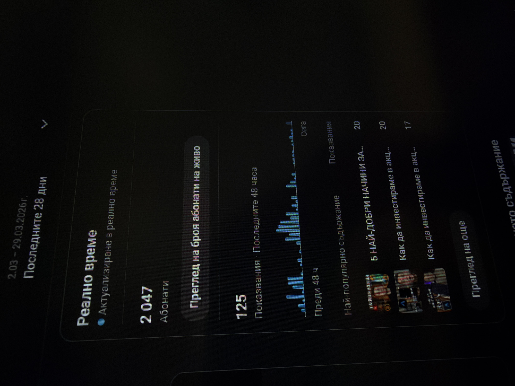 The image displays a screen capture of an analytics dashboard, likely from a social media or video platform. The dashboard is in Bulgarian, displaying metrics related to subscribers, views, and content performance. On the left, the "Real Time" metrics show 2,047 subscribers with live updates. Below that, there is a section showing "Views" (125) for the last 48 hours, accompanied by a graph illustrating the view count over time. On the right, the screen presents the "Most Popular Content," listing titles such as "5 Best Ways to...", and "How to Invest in..." with their respective view counts. Two thumbnails of video content are visible.