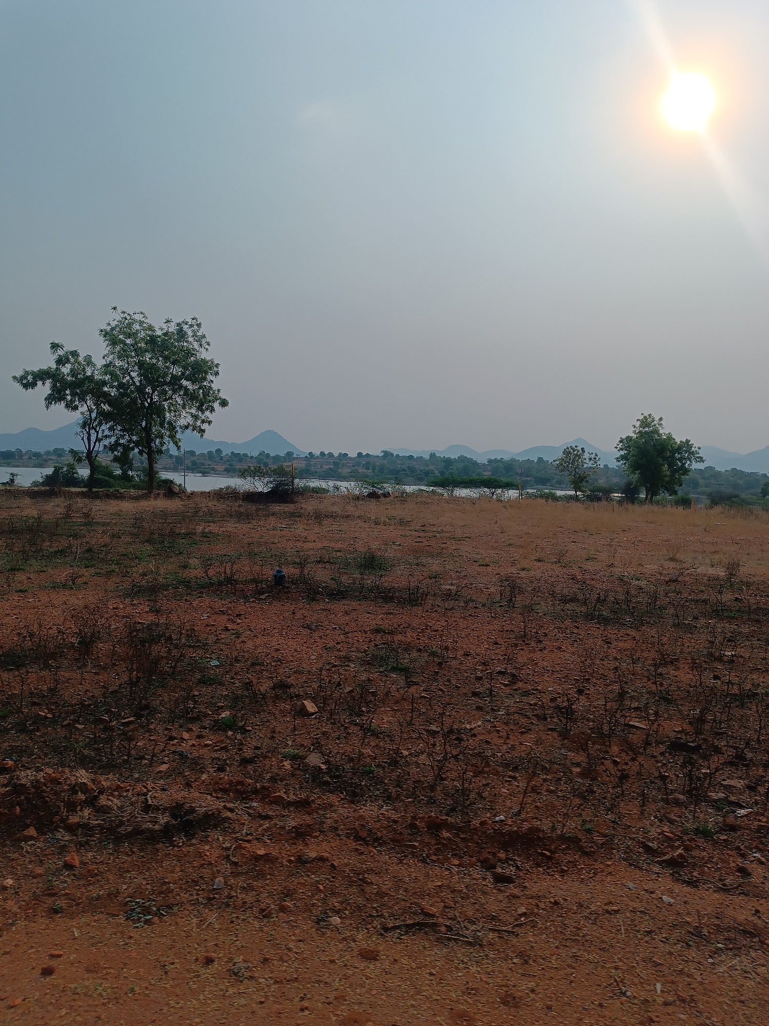 landscape in Kothacheruvu, India, with a foreground of red-brown, arid land sparsely covered with low vegetation. In the midground, there are a few trees, some of which are green and leafy. A body of water is visible beyond the trees, with some green vegetation along the shoreline. Distant hills or mountains are present on the horizon under a hazy sky. The sun is visible in the upper right corner, emitting a bright light. There are no people visible in the scene.