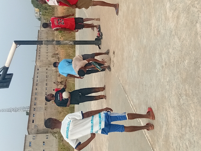 A group of people are standing on a basketball court. One person holds a soccer ball. One person is wearing a red Chicago Bulls jersey with the number 23 on it. There is a basketball hoop in the scene. A building and a cell tower are visible in the background.