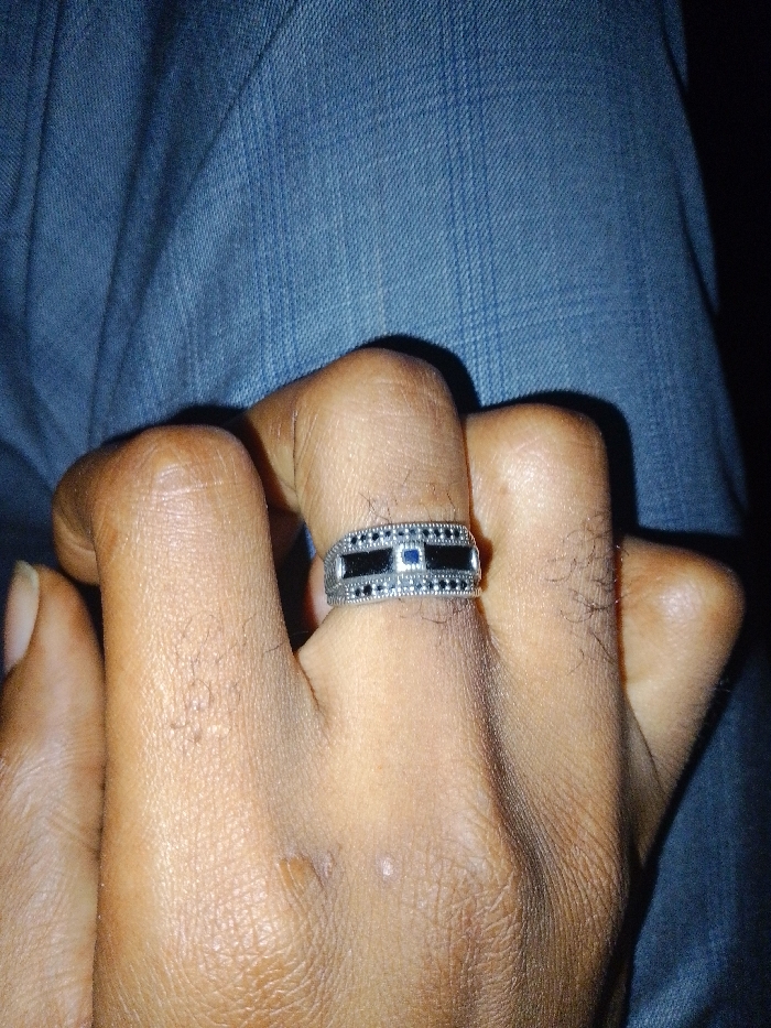 A close-up photograph displays a human hand, likely an adult's, with dark skin pigmentation and visible hair follicles on the fingers and dorsal aspect. The hand is positioned as if partially clenched or resting, with the fingers slightly curved. A metallic band ring is prominently featured on the fourth digit (ring finger). The ring is silver-toned or made of white metal, adorned with a central design consisting of two rectangular black inlays flanking a single, square blue stone. The top and bottom edges of the ring band are decorated with rows of small, dark, possibly set stones or textured details. The hand is resting on a textured blue fabric, consistent with denim, which forms the background of the image. The lighting appears subdued, creating soft shadows around the knuckles. No other individuals or specific environmental details are discernible. The scene is located in Gandu Albasa, Nigeria.