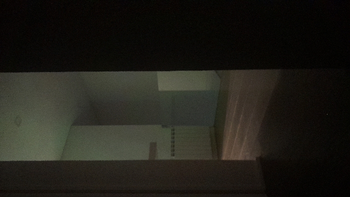 The image depicts a dimly lit, abstract view of a room, possibly from an elevated perspective. A bright white or light-colored surface extends across the lower portion of the frame, contrasted by darkness above. Faintly visible walls or surfaces form geometric shapes, with subtle gradations of color, potentially blue, in the background. A possible staircase or series of stacked objects appear vertically. The right side is mostly dark.