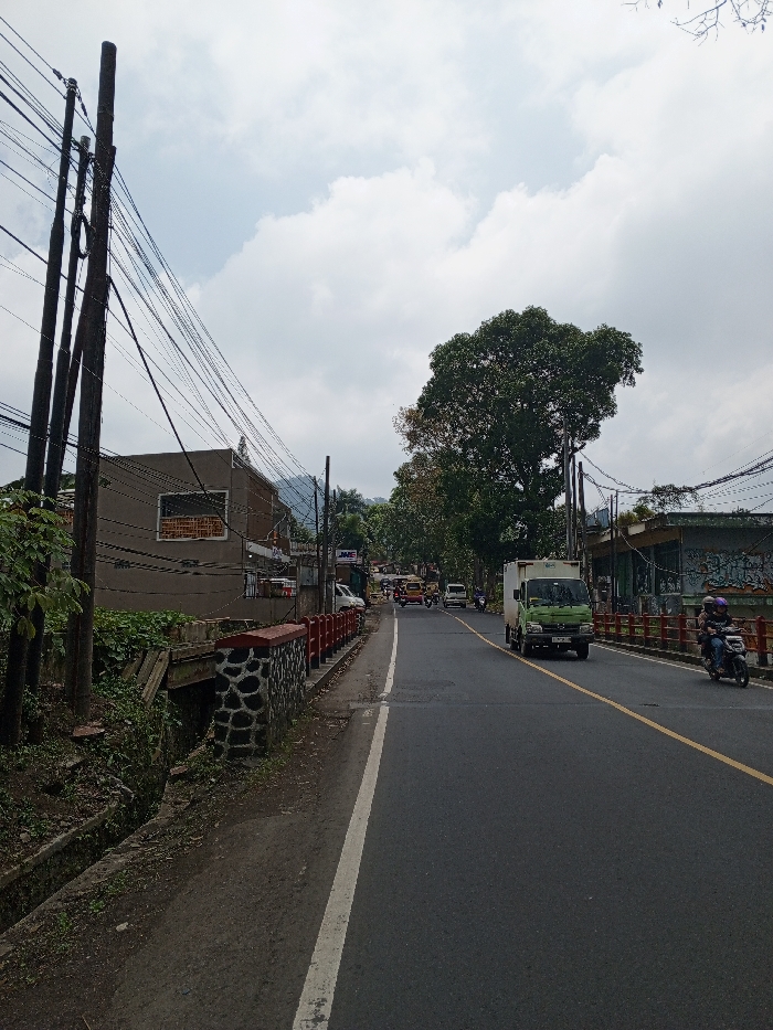 This image depicts a daytime street scene, purportedly located in Multhan, India, under a partly cloudy sky. The perspective is positioned on the left side of a two-lane asphalt road, extending down a slight incline. The road features a solid white line marking the left shoulder and a combination of dashed white and solid yellow lines delineating the center. On the immediate left, a dirt verge slopes into a concrete drainage channel. Beyond this channel, a low bridge is visible with a patterned dark stone base and a red-topped concrete railing. Behind this railing stands a multi-story building with a grey facade, exhibiting exposed construction materials within its window frames. Multiple dark wooden utility poles, heavily laden with numerous overhead electrical and communication wires, line this side of the street. Further along the left side, a sign displaying the 'JNE' logo is visible above parked vehicles, including a white car, amidst other buildings and dense foliage. On the right side of the road, a green box truck with a white cargo box is observed in the right lane, moving away from the viewer. Trailing the truck, a motorcycle carries two individuals, both wearing helmets, also proceeding away from the viewer. The right edge of the road is bordered by a red-topped railing, mirroring the one on the left, followed by a building featuring a dark facade and light-colored graffiti. A large, prominent tree with a full, dark green canopy stands further down the road on the right. In the far distance, a line of traffic is visible in the opposing lane, and hazy green hills rise against the horizon. The environment suggests an active urban or semi-urban thoroughfare characterized by mixed infrastructure and natural elements.