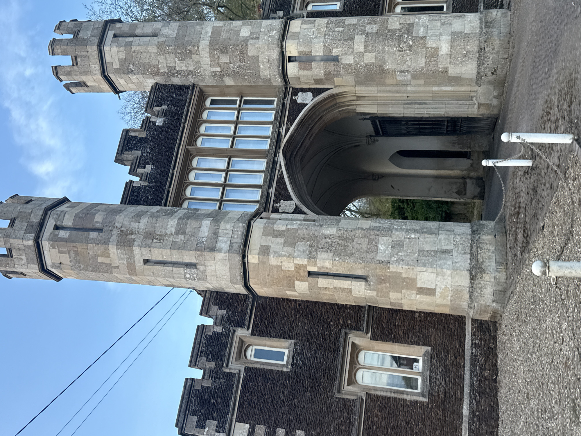This is a view of the South Gate in King's Lynn, West Norfolk, United Kingdom. The image captures the gate's architectural details, including its towers, windows, and arched entryway. The structure is constructed from various types of stone and brick. White posts and chains are visible along the walkway, which runs adjacent to the gate. The sky is visible in the background.