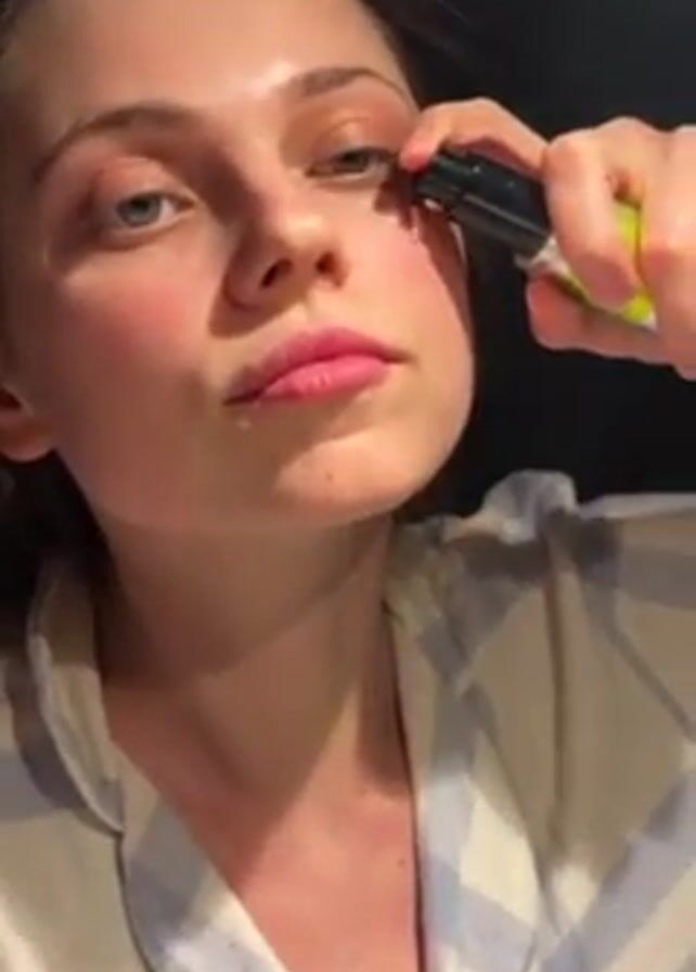 A young woman with fair skin, light eyes, and dark hair, wearing a blue and white striped pajama top, sprays her face with a dark-colored bottle. Yellow streaks are visible on her cheeks. She looks at the camera and smiles slightly. The background is dark and out of focus. A white cylindrical object is partially visible to the right.