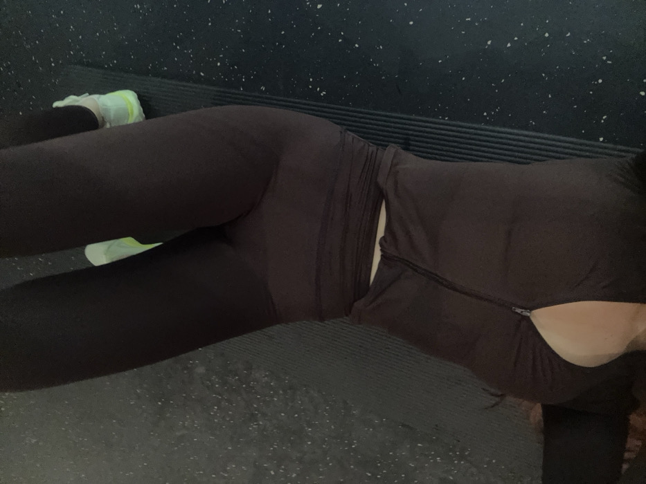 A person is depicted lying supine on a dark, ribbed exercise mat. The view is from directly above, encompassing the individual's torso, hips, and legs. They are dressed in dark brown athletic wear, consisting of form-fitting leggings and a long-sleeved top with a partially unzipped front, revealing a section of bare skin in the lower back or hip area. Light-colored athletic shoes with neon yellow accents are visible on the feet, which are elevated, suggesting a leg-raise or inverted pose. The exercise mat rests on a dark, speckled floor, consistent with a gym or fitness studio environment. No specific identifying features of a city, including Paris, France, are visible within the image to determine the exact geographic location.