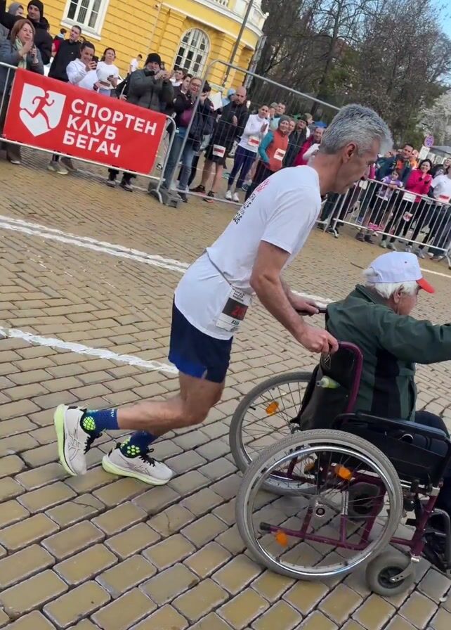 - "A man wearing a white t-shirt and running shorts pushes a man in a wheelchair across a bricked street" by FM-PU0HJ3, licensed under CC BY 4.0