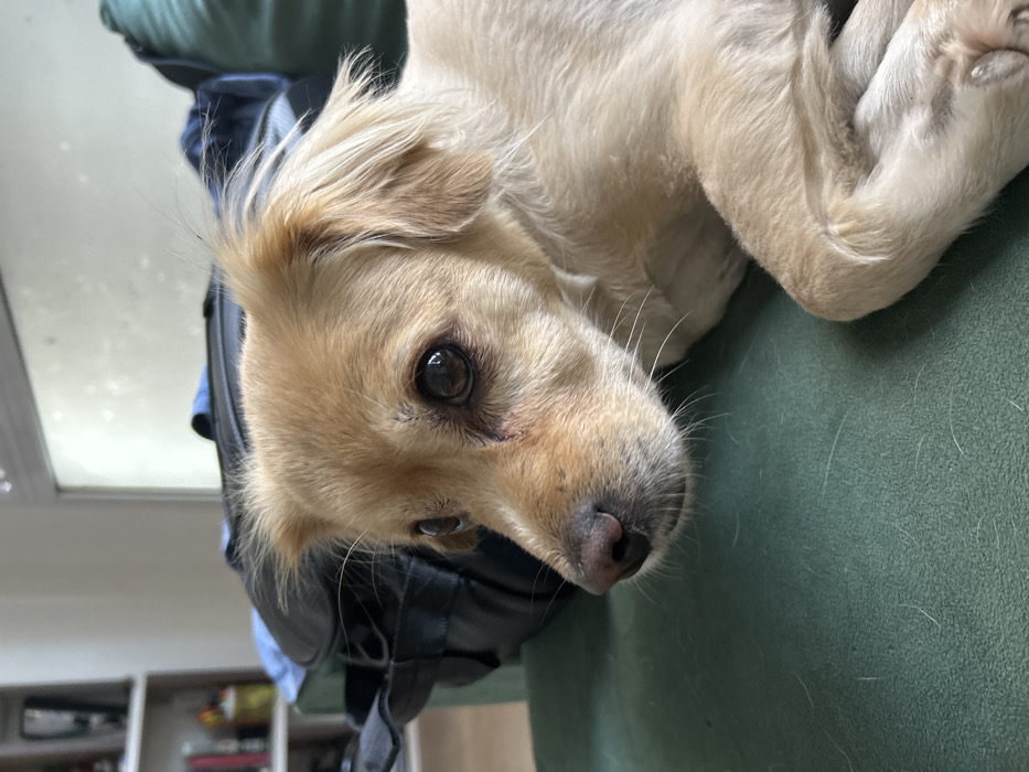 - "An indoor scene in Villa San Andrés, Argentina, depicts a light tan or blonde-furred domestic dog lying on a dark green upholstered surface" by FM-j80jY2, licensed under CC BY 4.0