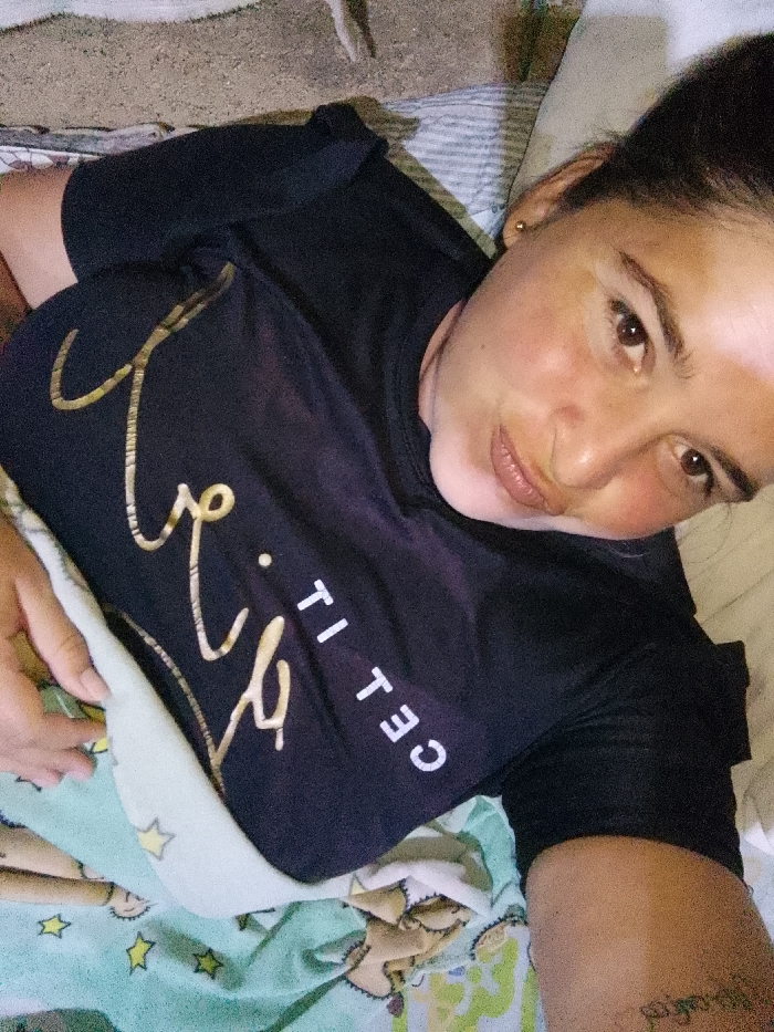 The image displays an adult female indoors; her specific location within Altagracia, Venezuela, cannot be determined from the visual information. The subject, estimated to be between 25 and 35 years old, has brown hair pulled back from her face and dark brown eyes directed towards the camera. Her skin is fair, with noticeable reddish flushing on her cheeks and forehead. She wears a black, short-sleeved t-shirt featuring gold cursive script, partially visible as "LIVE," and inverted white block letters, partially visible as "GET IT." A small, spherical, gold-toned earring is present in her left earlobe. A tattoo with dark script is visible on her right forearm. The subject is lying down, supported by a light-colored, possibly striped pillow, and partially covered by a light green blanket with yellow star patterns. Her left hand rests on the blanket. The scene's environment consists solely of bedding materials, illuminated by an artificial light source, indicating an indoor, domestic setting.