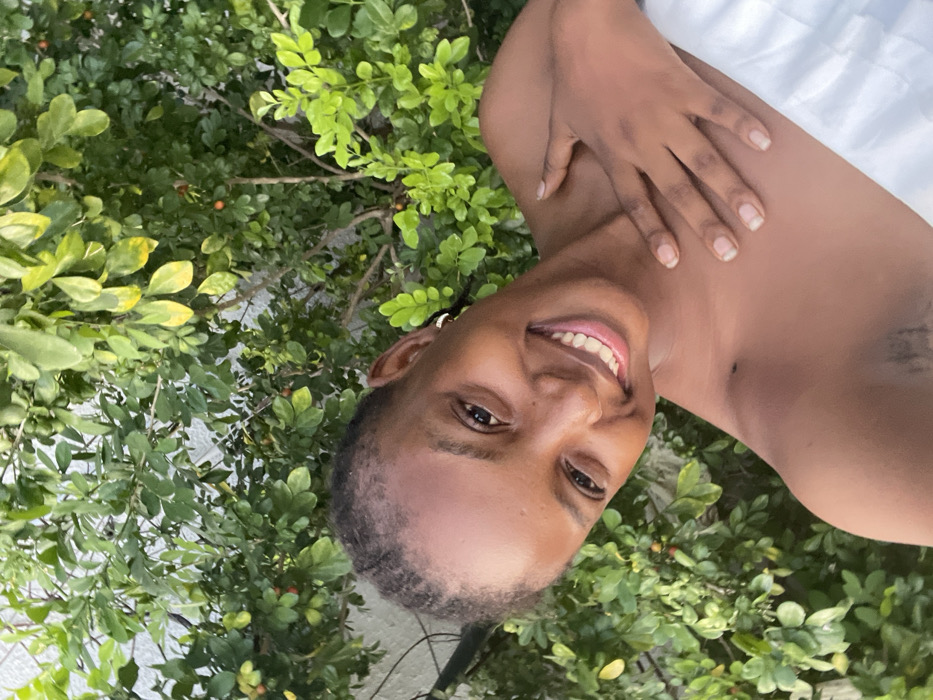 A smiling woman lies among verdant foliage. Her complexion is dark, and her gaze is direct and cheerful. A glimpse of white fabric suggests a shirt or sheet behind her shoulder. Her hand rests near her neck. Leaves and small berries scatter around her head, adding a natural, wild touch to the image. A small tattoo is visible on her shoulder. The photograph is rotated sideways.