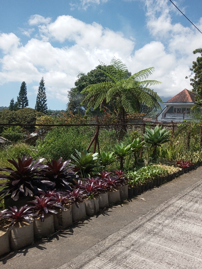 The image captures an outdoor scene in Bagochen Boolingpang Ueling, Bhutan, under a sky with scattered white clouds against a clear blue backdrop. In the foreground, a textured concrete path or narrow road extends diagonally from the lower left to the center right. Along the left edge of this path, a linear arrangement of potted plants is visible. This row features several large deep red and green bromeliads contained in light-colored grow bags, followed by smaller green plants in black polybags, and additional variegated and red-leafed plants. Beyond the plant arrangement, a rudimentary fence with horizontal bars or wires supported by posts separates the foreground from a dense, verdant expanse of uncultivated vegetation, including various bushes and trees. A large fern tree with prominent fronds stands to the right of the image center. Further to the left, two tall, slender coniferous trees are prominent against the sky. In the upper right background, a two-story white building with an orange-tiled gable roof and a white-railed upper balcony is partially visible, nestled within the distant greenery. The horizon features undulating terrain. No people or animals are present in the scene.