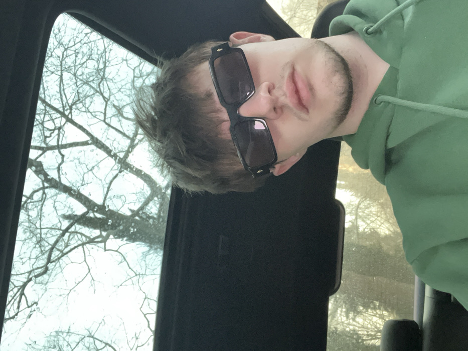 An individual is depicted in a front-facing portrait, seated within a vehicle. The subject is a male with dark, tousled hair and light facial stubble. He is wearing dark, rectangular sunglasses featuring gold-colored embellishments on the temples, and a plain green hooded sweatshirt. His gaze is directed forward. Above the subject, a vehicle sunroof is visible, partially covered with water droplets, through which a bare deciduous tree with multiple branches is silhouetted against a bright, overcast sky. The vehicle's interior headliner is dark-colored. In the lower background, through what appears to be a side window, additional bare trees are visible, illuminated by soft, diffused light. The scene is situated in the city of Stara Zagora, Bulgaria.