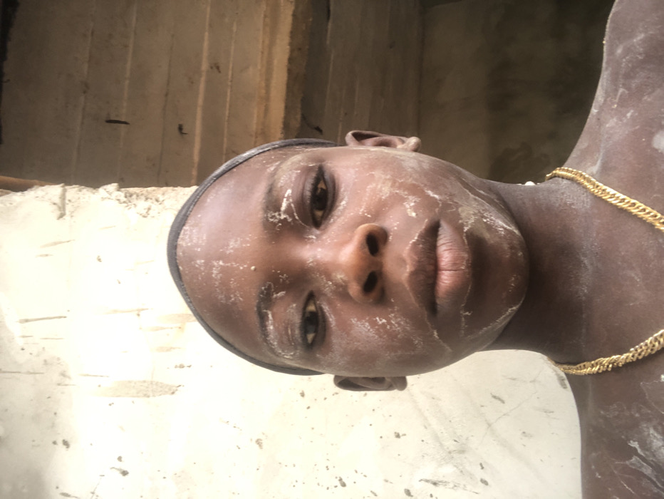 An image, likely a selfie, depicts a young individual with dark skin, positioned centrally and looking directly forward. The individual's face, neck, and upper shoulders are covered in a light-colored, powdery substance. A dark headband is visible across the forehead, pulling back the hair. A gold-colored chain necklace is worn, resting on the chest. The background features a textured, light-colored wall or structure to the left, exhibiting signs of wear and a rough finish. To the right, a darker, shadowed area suggests an interior space or opening with horizontal structural elements. The scene is located in Enugwu-Ukwu, Nigeria.