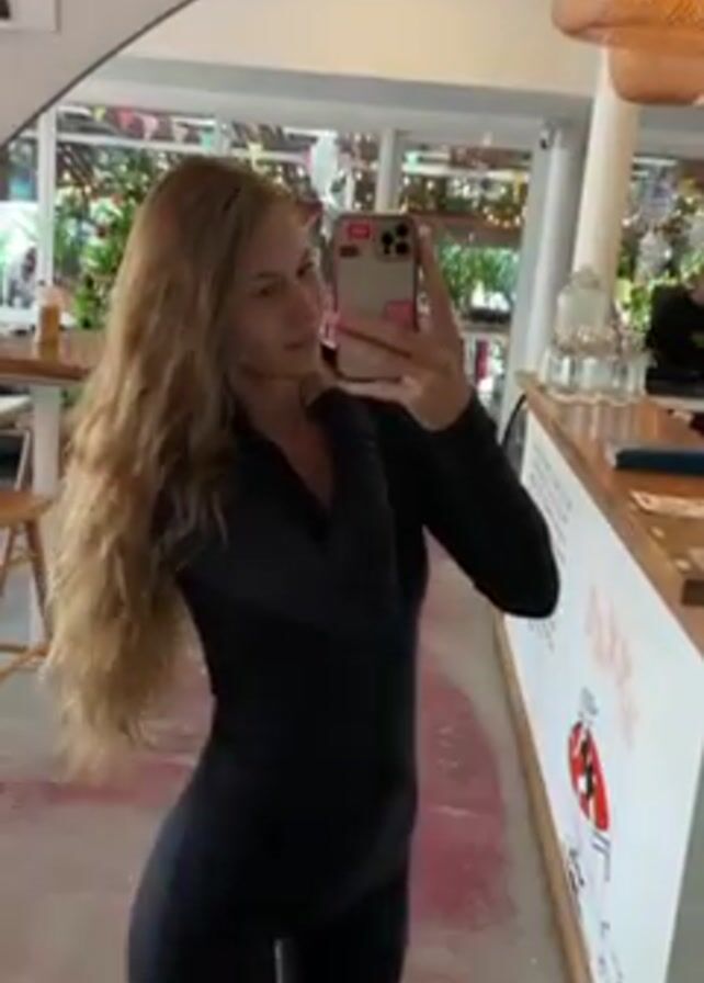 A young woman stands in front of a large, wavy mirror in what appears to be a cafe or restaurant. She has long, wavy blonde hair and is wearing a black, form-fitting jumpsuit with long sleeves. She is holding a phone in her right hand, taking a selfie in the mirror. The mirror reflects the interior of the cafe, including tables, chairs, plants, and a counter with various objects on it. There are black and white framed pictures lining the wall above the mirror. The floor is light-colored and has a painted design on it. The lighting in the space is bright. The woman turns slightly to show a side profile of herself.