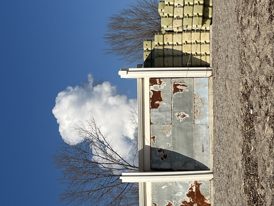 The image displays an outdoor scene in Prijevor, Montenegro, under a clear blue sky. A low, industrial-style structure occupies the midground, featuring a wall constructed from heavily rusted corrugated metal panels, exhibiting significant reddish-brown discoloration over a light grey base. This wall is framed by two white vertical support pillars, and a white horizontal fascia or gutter runs along its top. A diagonal shadow from an unseen object falls across the left portion of the rusted wall. To the immediate right of the right pillar, a dense stack of numerous light olive-green, rectangular buoyant modules, consistent with pontoon or dock sections, is neatly arranged. The foreground consists of dry, uneven brown earth with sparse, dark ground debris. In the background, skeletal deciduous trees with bare branches are visible on both the left and right sides of the central structure. Above the trees and structure, a large, dense, white cumulus cloud or plume rises prominently against the deep blue sky. No individuals are present.