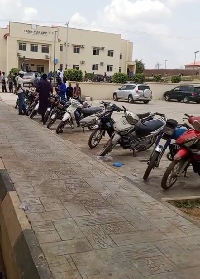exterior of a building labeled "Faculty of Law." A number of motorcycles are parked in front of it, along with some cars. People are walking around the parking area and near the building. The ground appears to be paved with patterned concrete blocks, and there are small patches of dry grass in the parking area. The sky is partly cloudy. There's some trash and debris on the ground.