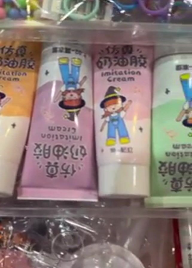 This video shows the contents of a drawer, likely part of a crafting or DIY set. At the top of the drawer are several tubes of cream or paste, labeled "Imitation Cream" in English, with a cartoon illustration of a girl in overalls and a witch hat. The tubes come in various colors: orange, pink, green, and light blue. The drawer also contains small, colorful beads and plastic rings in the upper section. The lower part of the drawer contains plastic containers, possibly molds, and a white marker. Everything is arranged neatly within the drawer.