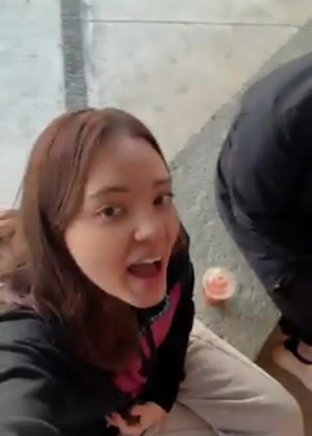 A woman with long brown hair and a black hooded sweatshirt with a pink design takes a selfie video outside on a paved area. A young man with dark hair and glasses sits nearby. They are sitting or standing near a building with an orange and white exterior. The woman smiles and looks at the camera. At one point she opens her mouth in what appears to be a shout. The man drinks from a plastic cup with a straw, and gives a thumbs-up gesture. The area is illuminated with natural light.