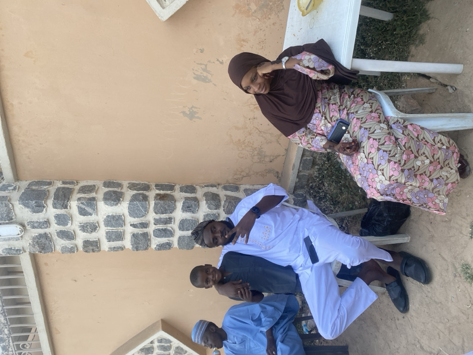 A group of four individuals pose outdoors. A woman in a floral dress and brown hijab sits in a white plastic chair, holding a phone. Next to her, a man in a white outfit makes a hand gesture, arm around a boy in a gray shirt. Another man in a blue robe sits at the bottom. A stone-covered building wall forms the backdrop, with a beige wall above. Grass and a metal fence are in the periphery.