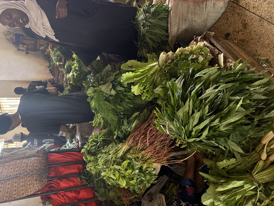The image depicts an indoor section of the Darajani Market in Stone Town, Zanzibar City, Tanzania, bustling with activity centered around fresh produce. The foreground and midground are dominated by extensive piles of bundled green leafy vegetables, including varieties with prominent red root systems, broad dark green leaves, and lighter green frilly leaves, many appearing moist. On the right, a woman with dark skin, wearing a black abaya and a light beige hijab, stands, her right hand reaching towards a pile of greens. In the midground, a man with dark skin, wearing a black t-shirt, stands with his back to the camera, attending to other produce. To his left, another man with dark skin, wearing a dark t-shirt displaying "ENERGY 10" and a white skullcap (kofia), is partially visible, also engaged with produce. A fourth person's legs, clad in a patterned garment, are visible seated on the lower left amidst the greens and crumpled newspaper. A patterned fabric bag hangs from a red metal frame in the upper left. A beige and red-striped burlap sack is visible on the far right. The market space features light-colored walls, a concrete floor, and natural light originating from overhead or side openings. The scene illustrates active commercial exchange within a traditional market setting.