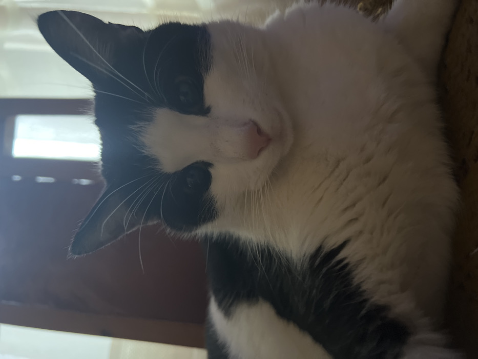 - "A domestic feline, characterized by a black and white bi-color coat, is depicted lying on a surface indoors in Shemshevo, Bulgaria" by FM-MmCJp2, licensed under CC BY 4.0