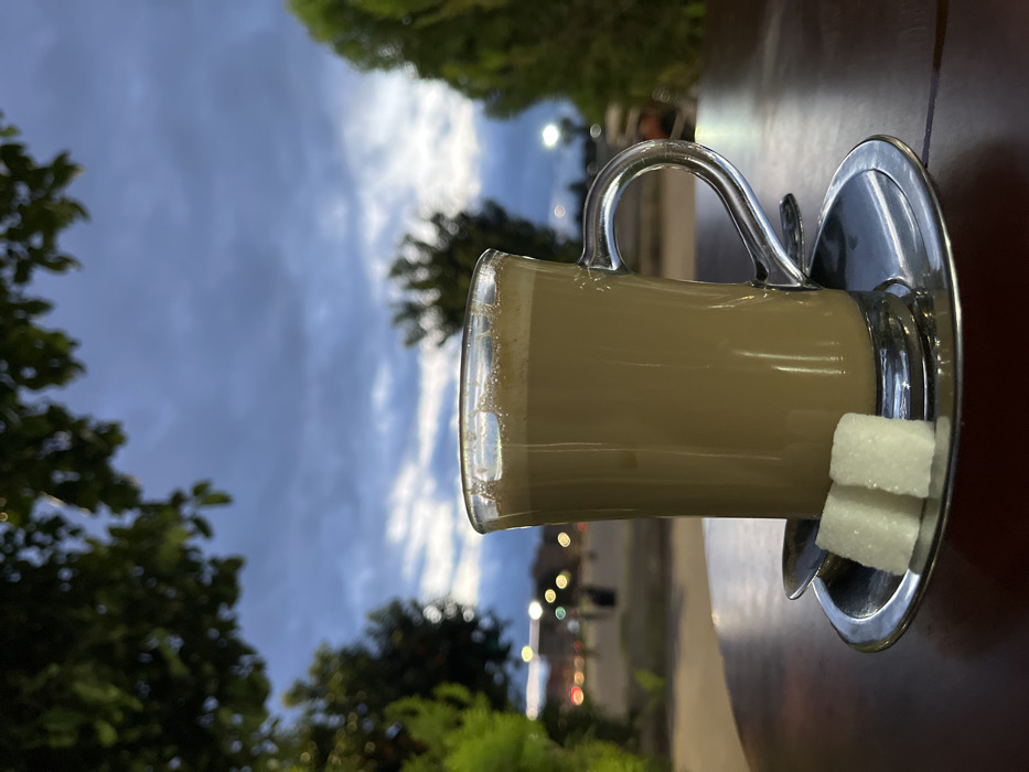 A glass mug filled with a tan-colored beverage rests on a metallic saucer, accompanied by two sugar cubes. The scene unfolds outdoors, with trees and a cloudy sky visible in the background. Streetlights illuminate the periphery, suggesting twilight or evening. The mug sits on a wooden surface, possibly a table.