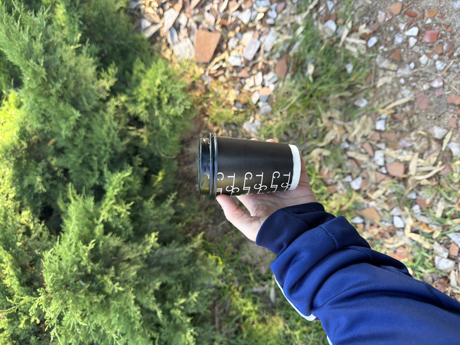 - "A human left arm, dressed in a dark blue athletic jacket with white stripes, holds a black disposable coffee cup featuring a white paper sleeve at its base and a black lid" by FM-kv6z32, licensed under CC BY 4.0