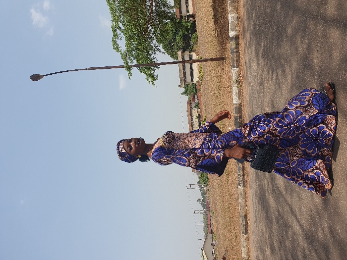 In Ogbogbo, Nigeria, a female individual is captured walking on an asphalt road. She wears a floor-length dress and matching headwrap featuring a blue, brown, and gold floral pattern. Gold-colored hoop earrings are visible. She holds a small, black, structured handbag in her right hand and wears dark, open-toed sandals. Her head is turned toward the viewer, displaying a slight smile with visible teeth. To her right, a tall, dark street light pole rises. Behind her, a low concrete curb borders an elevated expanse of dry, light brown vegetation. In the background, several low-rise, light-colored buildings with dark roofs are visible, interspersed with green tree foliage. The sky is light blue with minimal cloud cover, indicating a clear, sunny day.