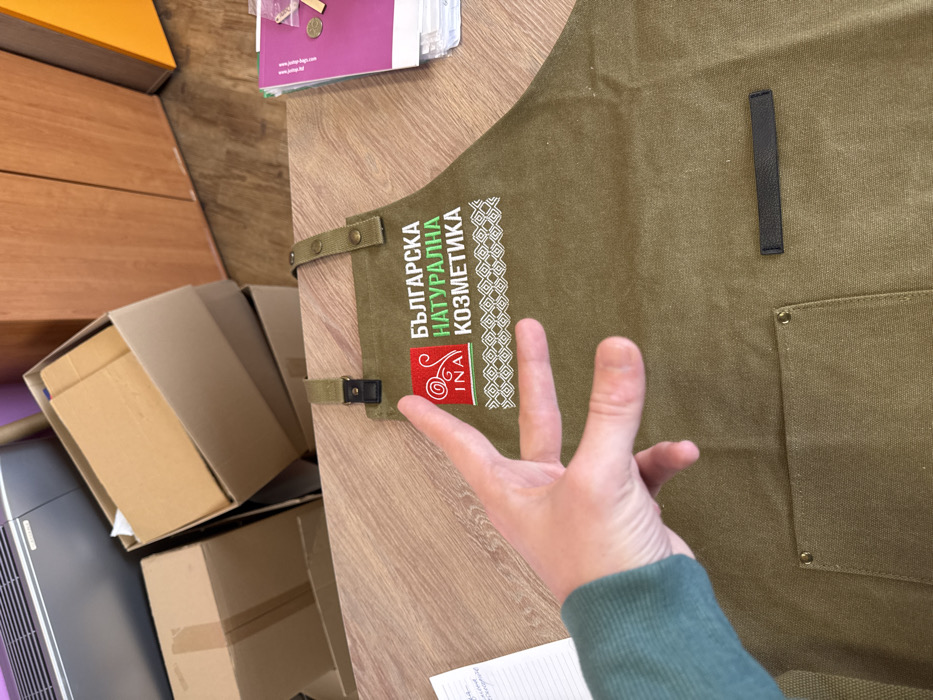 The image depicts an olive-green canvas apron laid flat on a light wood-grain table in an indoor location within the city of Unknown, Bulgaria