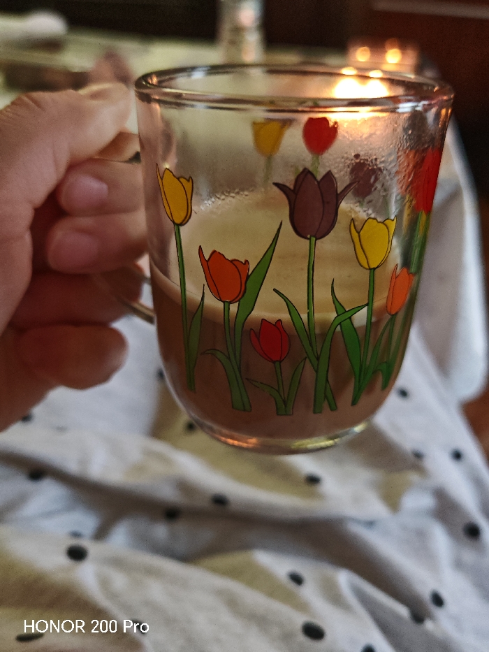 The image depicts a close-up, indoor scene, the exact location within Haskovo, Bulgaria, cannot be determined from the visual information provided. A human left hand, with visible fingernails, grasps the handle of a transparent glass mug positioned centrally. The mug is decorated with multiple stylized tulip decals in shades of yellow, orange, red, and dark brown/purple, each with green stems and leaves. The glass shows condensation. The mug contains a brown liquid, likely a beverage, topped with a layer of lighter-colored foam. In the immediate foreground and below the mug, a white or light-colored fabric patterned with irregular black polka dots is visible. The background is heavily blurred, revealing several indistinct points of warm light consistent with blurred candle flames, suggesting a dimly lit environment. The bottom left corner of the image contains a watermark reading "HONOR 200 Pro".