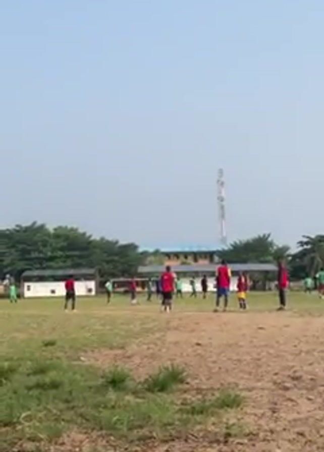 group of people playing soccer on a field. The players are wearing various colored jerseys, including red, green, blue, and yellow. The field is a mix of grass and dirt, and there is a building in the background. A tall cell tower rises behind the building. The sky is clear and light blue. The camera is handheld and moves slightly, providing a view of the game from a distance.