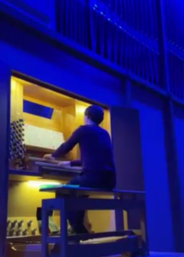 A person sits on a bench facing and playing a pipe organ. They are wearing a long-sleeved shirt and dark pants. The organ is encased in a wooden structure with yellow lights illuminating the instrument. Above the organ are tall, blue, vertical metal tubes. The room is lit with a strong blue light. The camera angle is low, looking up at the musician and the organ.