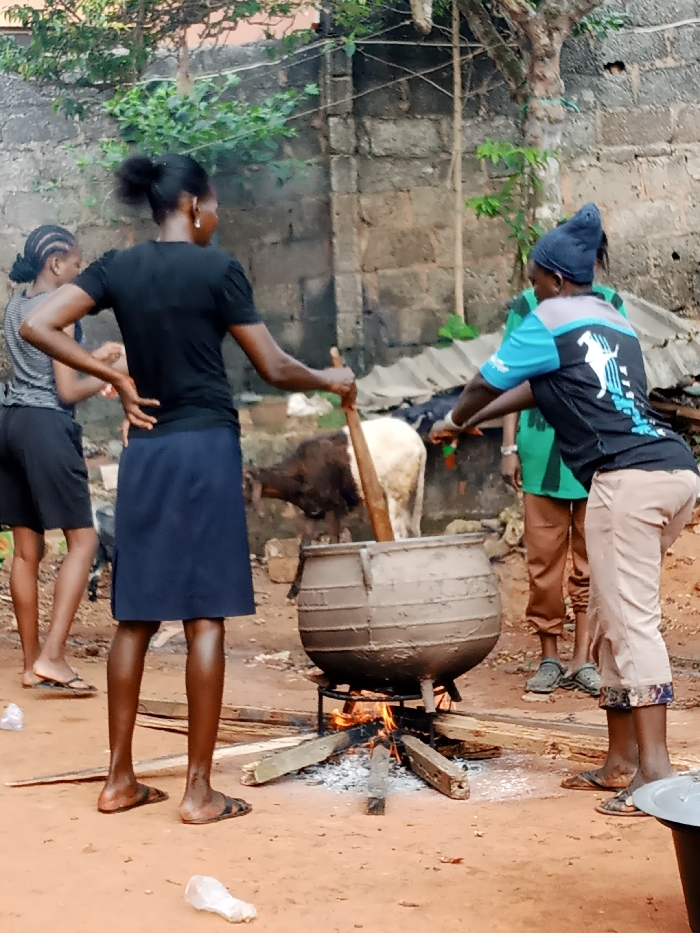 - "An outdoor scene in a residential area of Lagos, Nigeria, depicts four individuals engaged in or observing a communal cooking activity" by FM-ht8ij1, licensed under CC BY 4.0