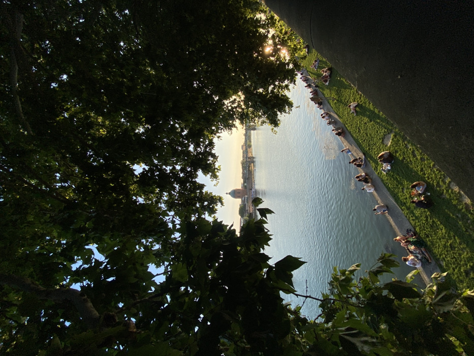 river view framed by foliage. People sit or stroll along the riverbank, a grassy area bordering the water. A dome-topped building and other structures are visible across the river in the distance. The sun appears near the upper edge of the frame. The scene is shot from an elevated perspective, looking down through tree branches.
