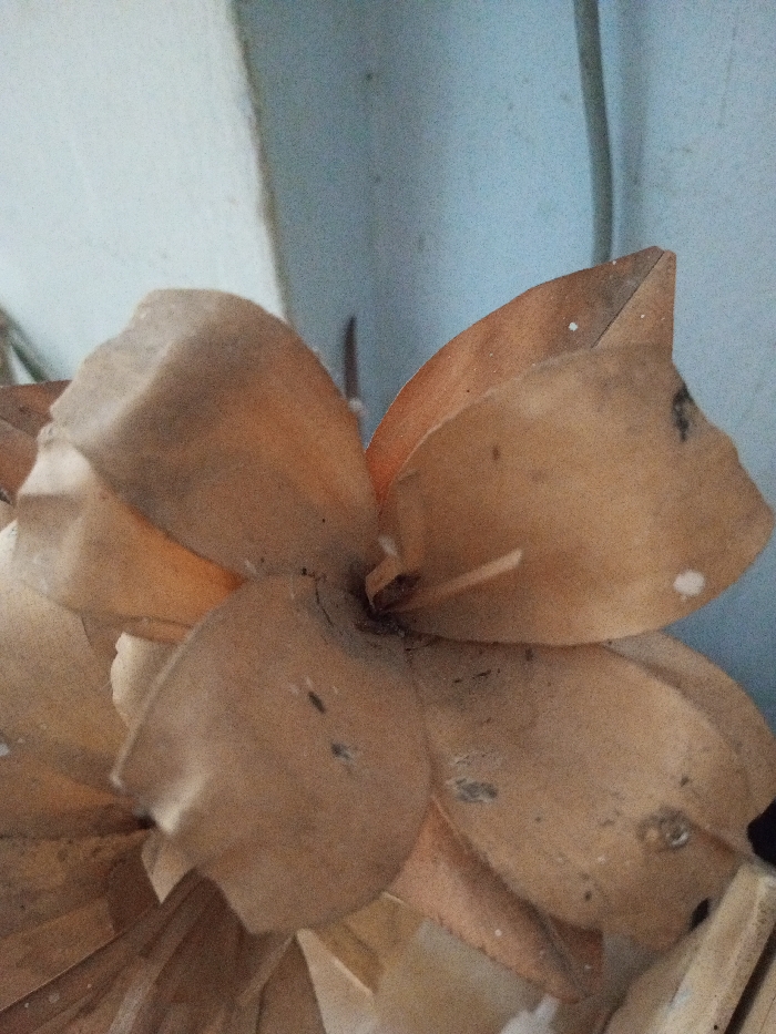 A close-up depicts dried flower petals arranged concentrically, forming a layered blossom. The petals are a muted, light brown color, with visible spots and imperfections. They have a papery texture, with some edges torn or curled. The background features a wall with varying shades of pale blues. The overall composition has a slightly aged or vintage appearance.