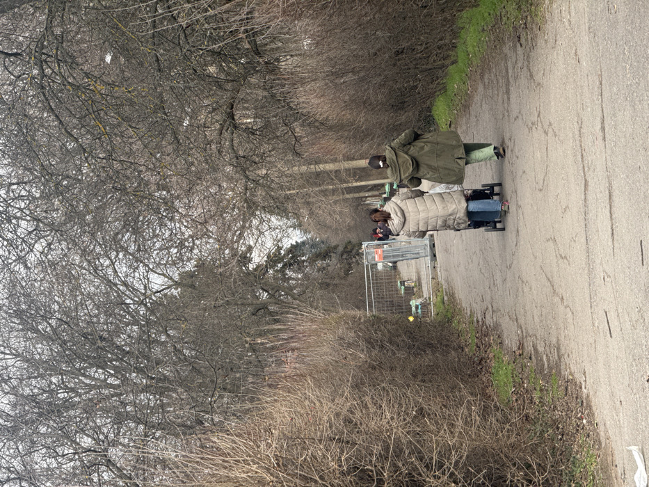 The image displays a park scene in Sofia, Bulgaria, under an overcast sky during a dormant season, characterized by leafless trees and hedges. A wide, unpaved or gravel path, exhibiting minor cracking and wear, recedes into the background. In the foreground, viewed from behind, two adult females are walking away from the camera. The woman on the left wears a light beige quilted puffer coat, blue jeans, and reddish-brown shoes, pushing a dark-colored baby stroller with a partially visible occupant. The woman on the right wears a dark olive green hooded coat and light green trousers. Both have dark hair pulled back. The path is bordered on both sides by dense, leafless deciduous hedges. Beyond the hedges and along the path, numerous mature deciduous trees with bare, intricate branches dominate the background and upper frame. In the midground, to the left of the path, a segment of temporary metal construction fencing, adorned with orange warning signs, encloses an area containing several light green bins or containers. A small group of indistinct individuals is visible further down the path, beyond the construction barrier. Sparse patches of green grass are visible along the edges of the path, and a piece of white litter lies on the ground in the lower-left corner.