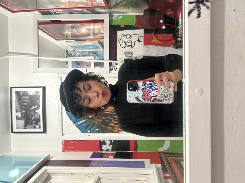 A person with curly hair and a black hat takes a selfie in a mirror. The person wears a black turtleneck sweater. Their phone case has a design with hamsas and lettering. The background is a cluttered room with framed artwork, posters, and a basketball hoop. The mirror frame is white with black markings.