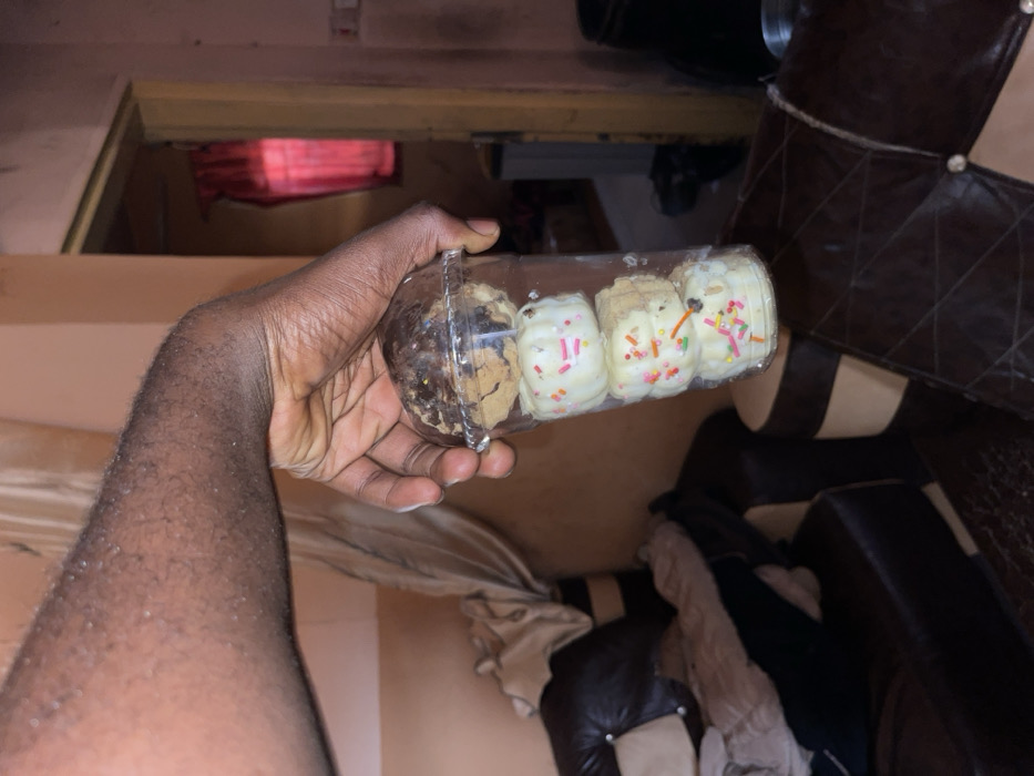 - "A dark-skinned human arm and hand are positioned in the center, holding a clear plastic cup containing four confectionery items" by FM-D7KQv1, licensed under CC BY 4.0