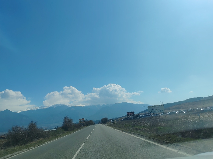 The image depicts a static, wide-angle view from a vehicle, facing forward on a two-lane asphalt road, presumably in Piperevo, Bulgaria. The road, marked with a solid white line on its right edge and a broken white line towards the center, recedes into the distance. To the immediate left of the road, sparse, dry vegetation and small bare shrubs line the shoulder, beyond which lies a visible valley and distant residential structures. Further in the background, a prominent range of mountains with snow-capped peaks extends across the horizon. To the immediate right of the road, a similar strip of dry vegetation and small bushes is present. Beyond this vegetation, a large outdoor area contains numerous parked vehicles, including cars and possibly larger vehicles, suggesting a storage lot or junkyard. Several billboards or large signs, one with Cyrillic text, are positioned between the road and the vehicle storage area. The upper two-thirds of the image show a clear, bright blue sky with several scattered white cumulus clouds. No individuals are visible in the scene. The lighting indicates a sunny daytime environment.