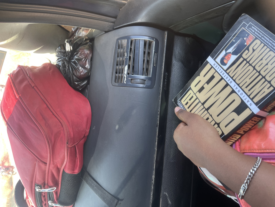 The image depicts the interior of a vehicle, observed during daytime in Hoss, Nigeria. A dark red fabric backpack, appearing somewhat worn, rests on the vehicle's dark-colored dashboard on the left. Adjacent to it on the right, a black plastic bag, tied at the top, is also on the dashboard. Further to the right on the dashboard, an air conditioning vent with horizontal slats and a circular control knob is visible, exhibiting minor cosmetic damage with white scuff marks. Below the vent, an "AIRBAG" label is present. In the lower foreground, a person's right hand with dark skin and a silver-colored chain-link bracelet holds a copy of the book "Unlimited Power" by Anthony Robbins, which is labeled a "NATIONAL BESTSELLER." Through the vehicle's window in the upper left background, blurred bright outdoor light and indistinct shapes, including a red object resembling a vehicle or motorcycle, are visible.