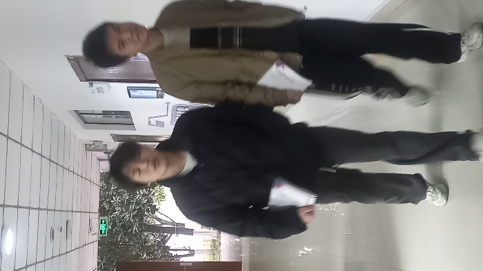 Two blurry figures are walking down a tiled hallway. The upper figure is wearing a khaki jacket and dark pants. The lower figure wears a black jacket and gray pants. Both appear to be carrying papers. A door labeled '315' is visible on the left. Windows line the left wall, revealing greenery outside. An exit sign is partially visible. The floor is light-colored, and the overall lighting is bright.