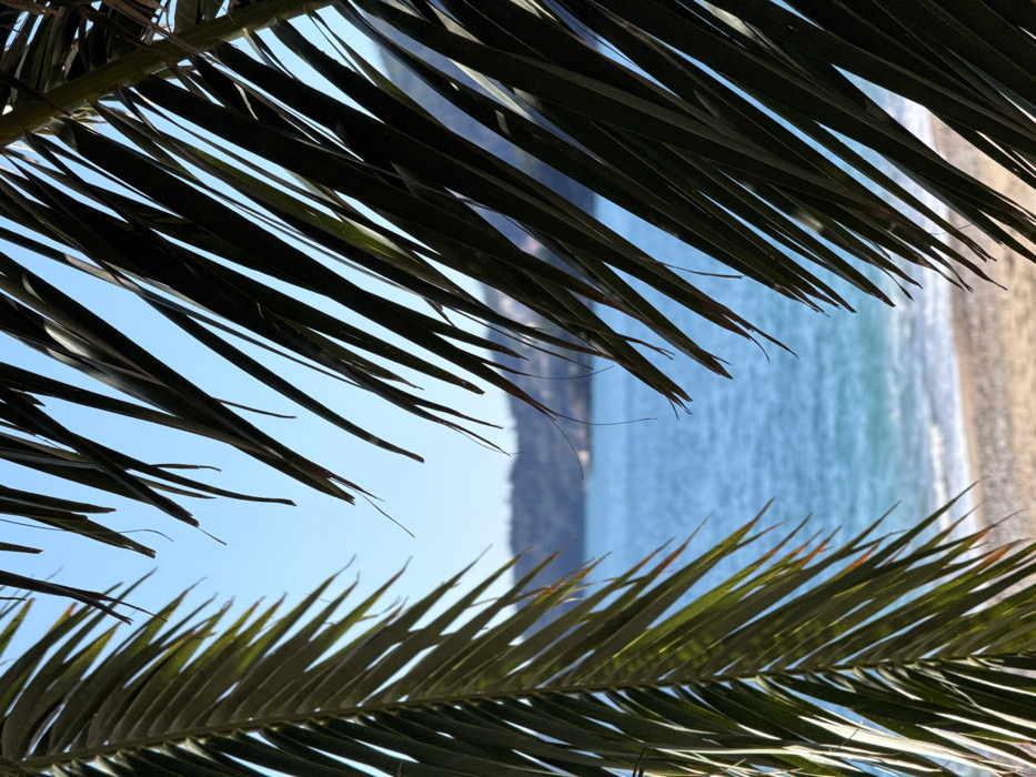 The image depicts a static outdoor scene at Kamenovo Beach, Montenegro. The view is framed by two sets of dark green palm fronds, one occupying the left vertical third and the other the right vertical third of the frame, converging slightly towards the center. Through this natural aperture, a tranquil bay is visible under a clear, light blue sky. In the midground, a light brown pebble and sand beach extends horizontally, meeting calm, turquoise-blue seawater where subtle white foamy waves break along the shoreline. The sea surface is slightly rippled. In the background, a distant mountainous coastline, covered with green vegetation, stretches across the horizon, with indistinct light-colored structures possibly present on its slopes. No individuals or active subjects are discernible within the frame.
