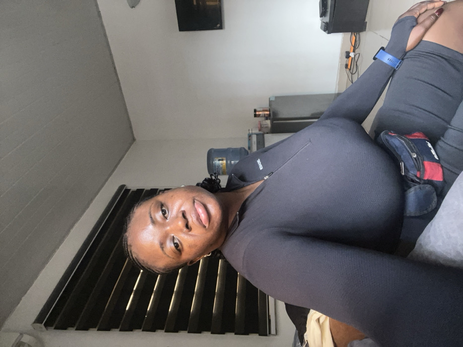 A dark-skinned woman in a dark gray athletic outfit lies on a couch with her legs bent. She wears a blue smart watch on her wrist and has a small bag or pouch resting on her lap. Her hair is braided back. Behind her are window blinds and a large water bottle. A small black object and a picture hang on the wall. The scene is well-lit, and the woman is looking directly at the camera with a slight smile and her tongue slightly protruding.